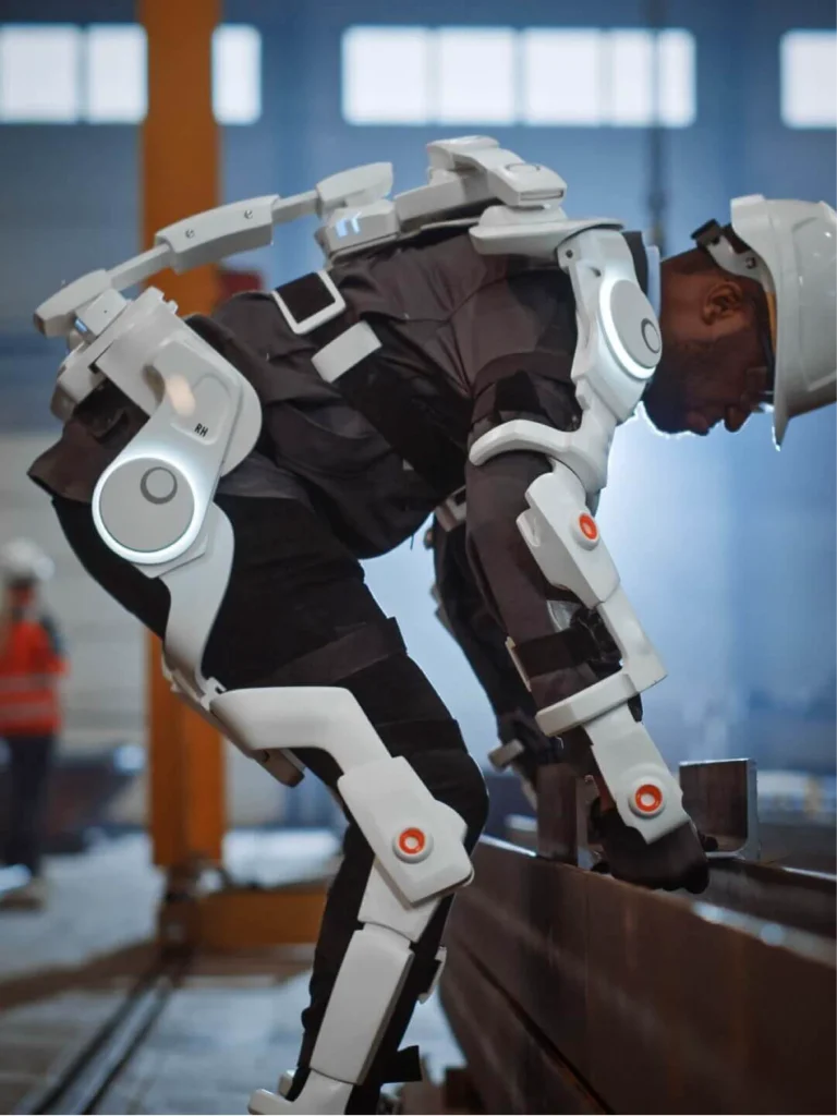 • Ils peuvent être conçus à destination d’un usage industriel. Ils peuvent assister les travailleurs.euses dans le levage ou l’exécution de tâches répétitives. Cela permet de réduire la fatigue et le risque de blessures ou de troubles musculo-squelettiques.